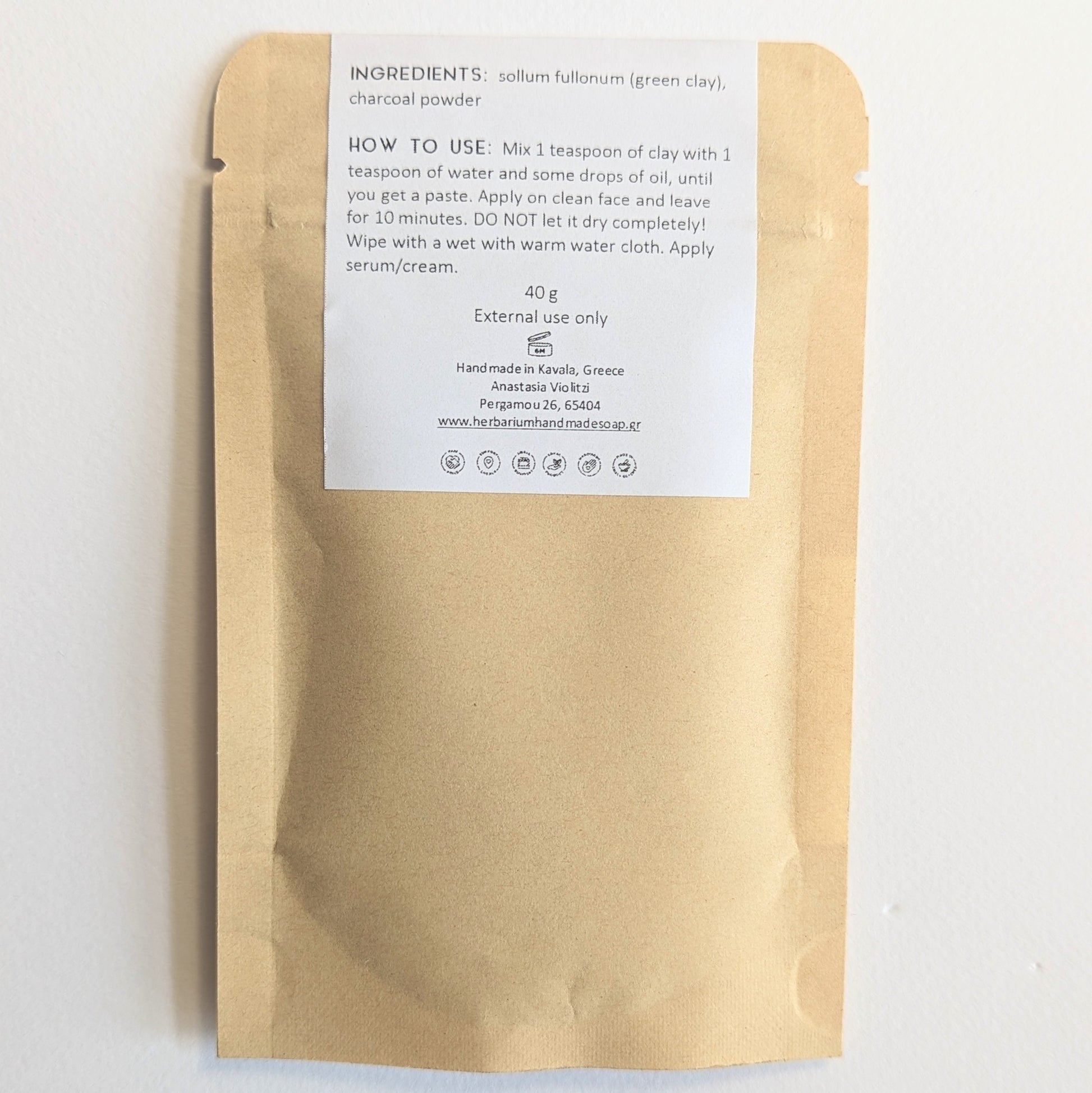 INGREDIENTS: sollum fullonum (green clay), charcoal powder